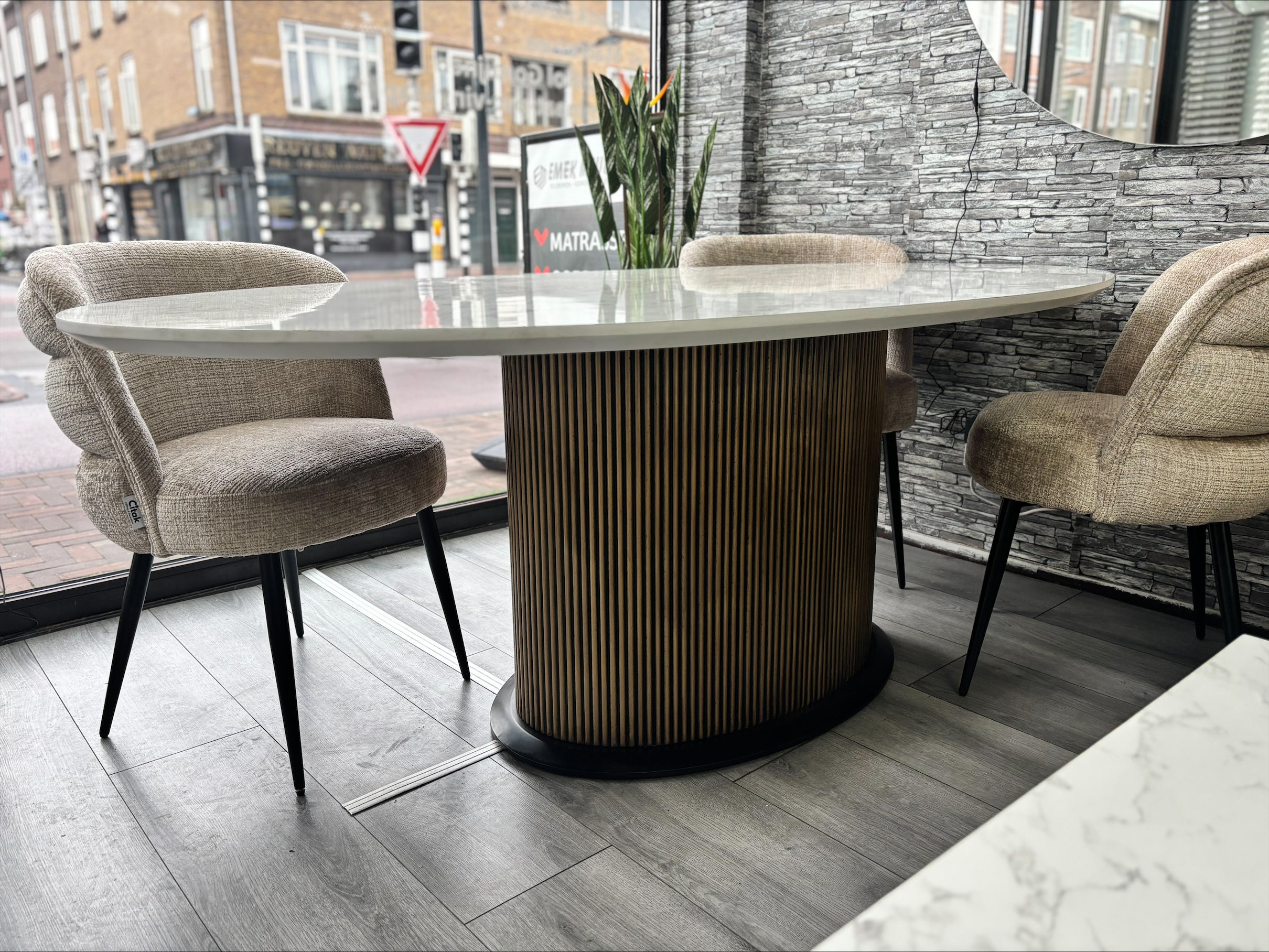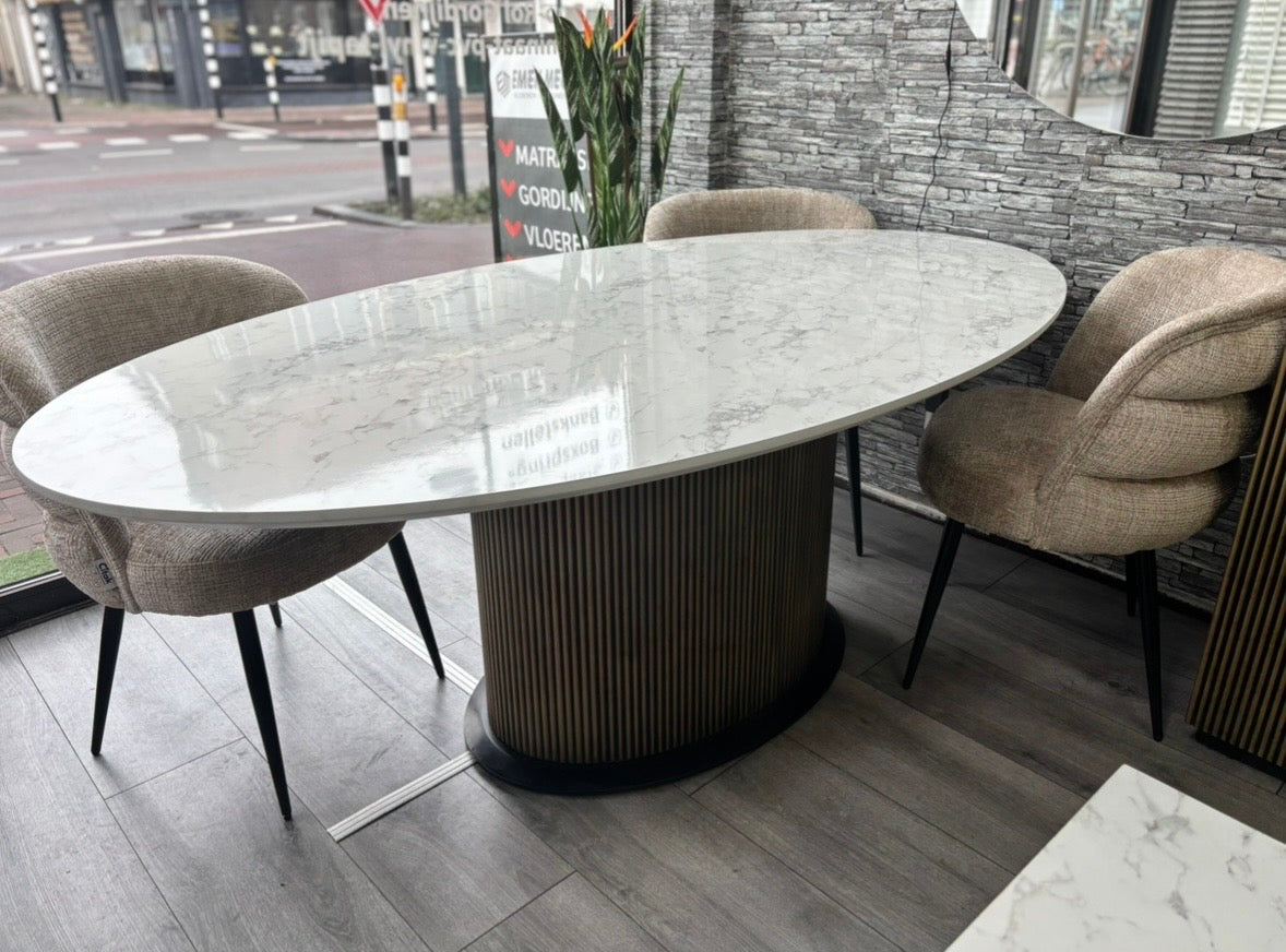 Luxe Ovale Eettafel – Wit Marmerlook & Geribbelde Houten Kolom