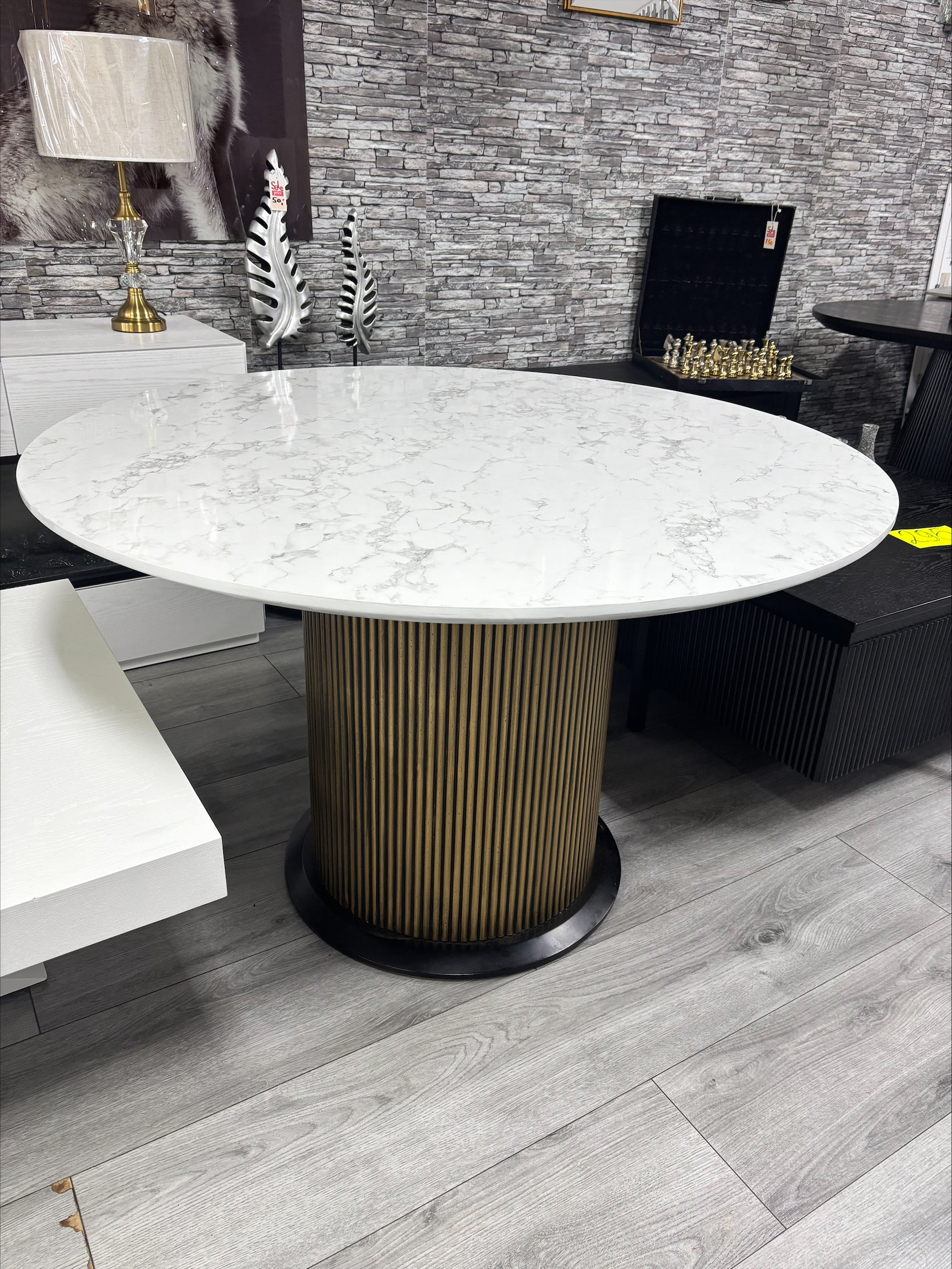 Luxe Ronde Eettafel – Witte Marmerlook & Geribbelde Gouden Kolom