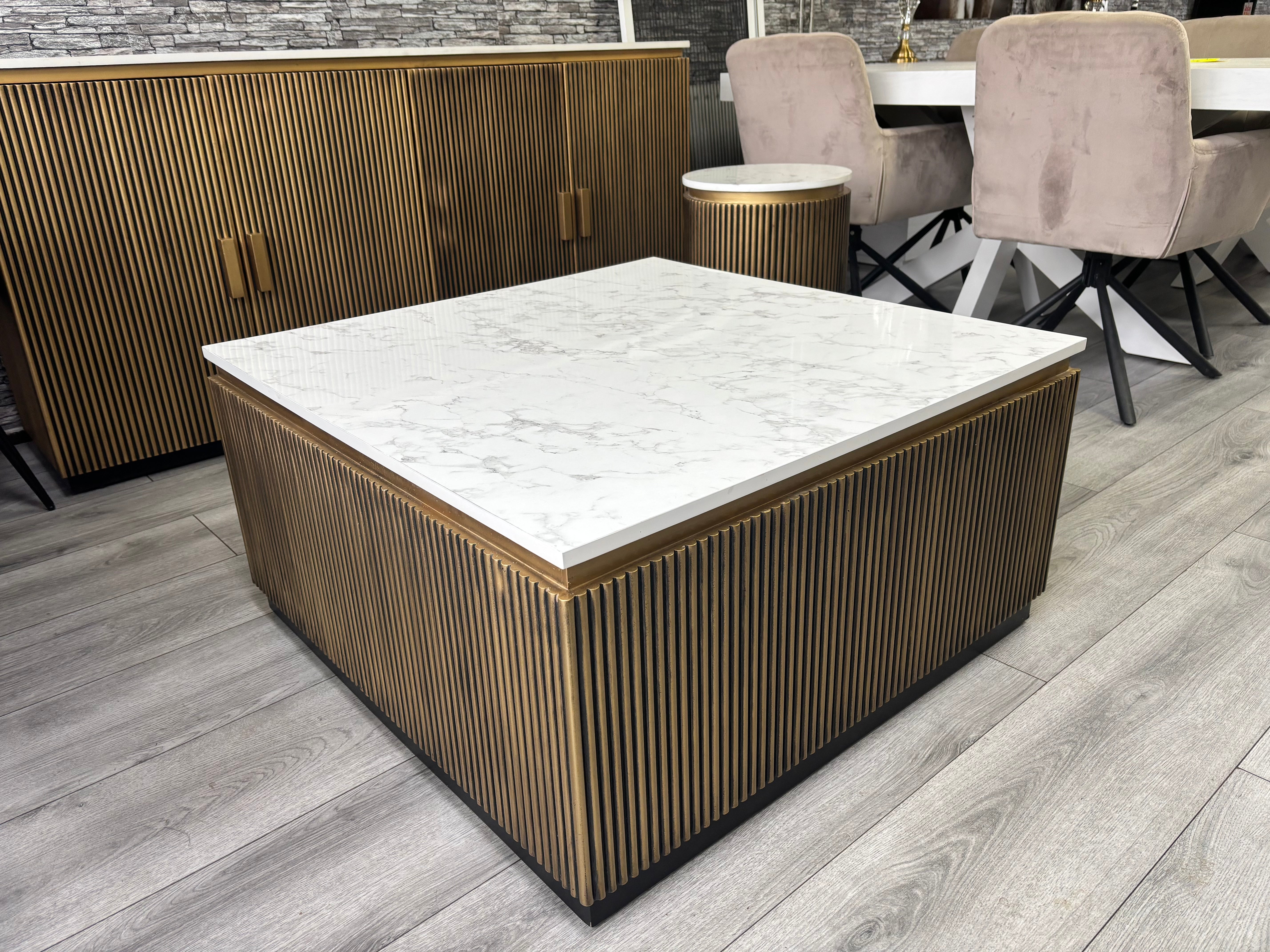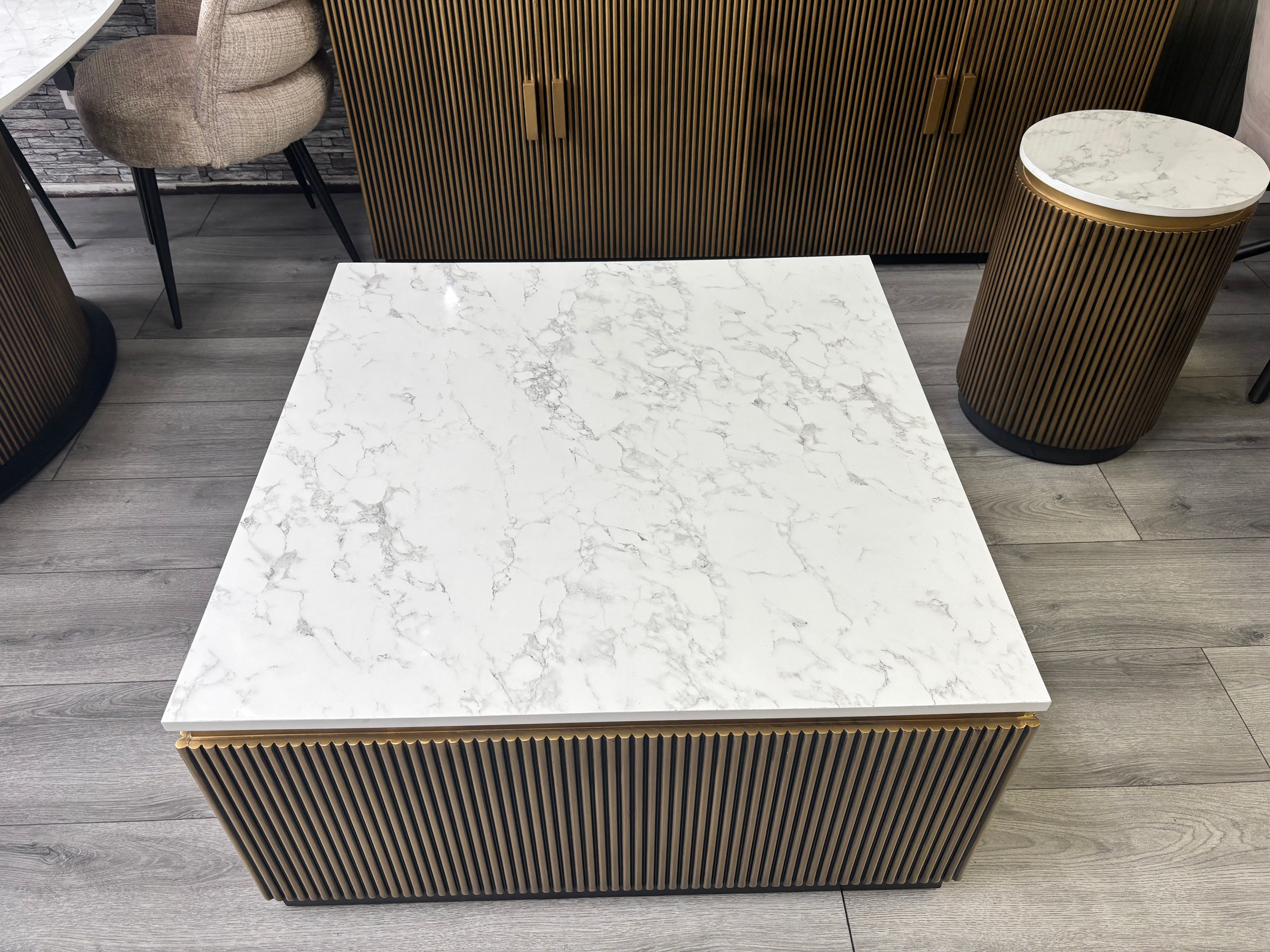 Luxe Vierkante Salontafel - Marmerlook & Geribbeld Brons Design (90x90 cm)